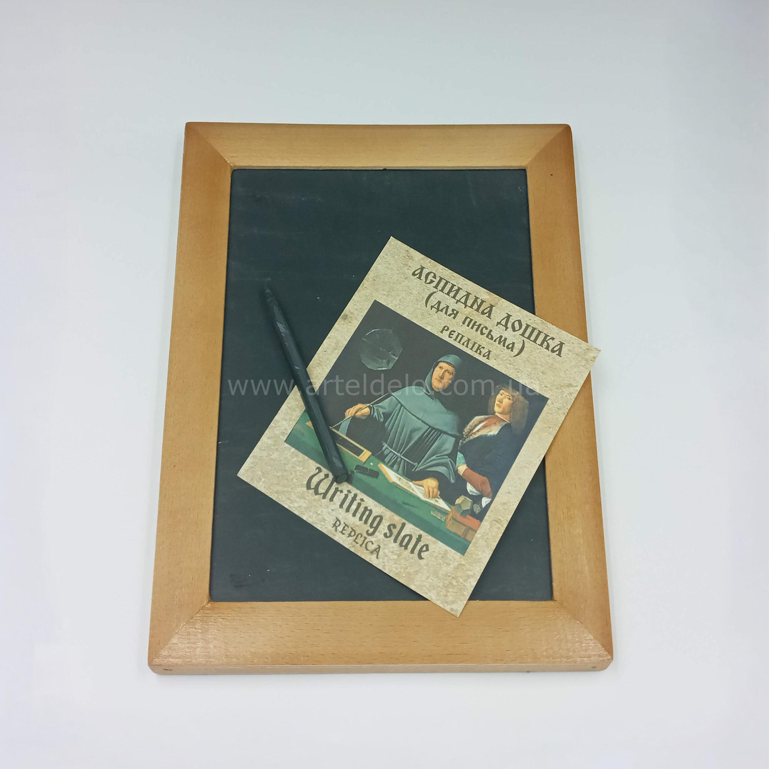 Історичний інструмент для навчання XIV–ХІХ століття. Аналог шкільної дошки. Пластина природного сланцю в дерев’яній рамі. Розмір 15–21 cм. Грифель 9–10 см. Латунні кутки-держаки. Подарункове пакування з історичною довідкою мовами: українською та англійською.