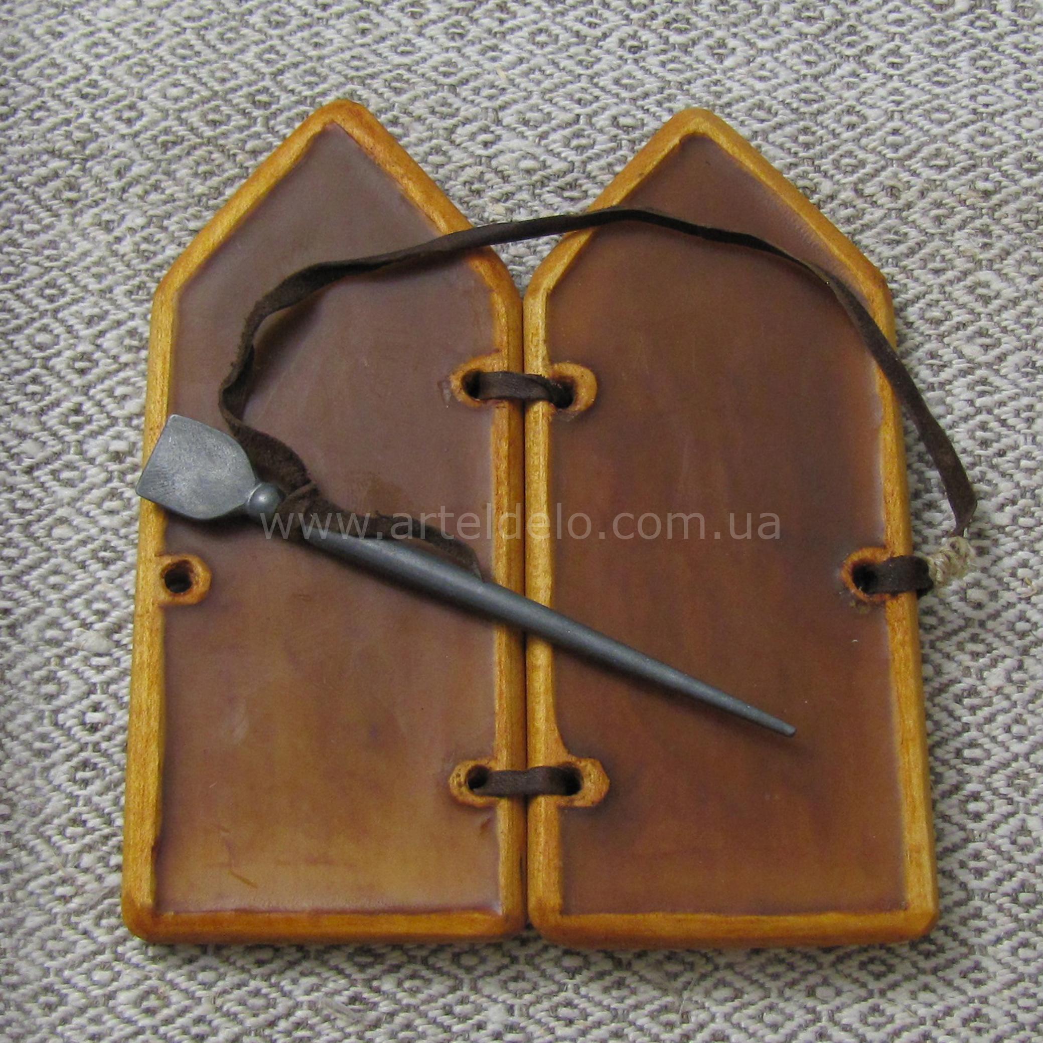 Дві дерев’яні воскові дошки, з’єднані шкіряним шнурком, із заглибленням для заливки воску за середньовічним рецептом. Використовувалися для ділових записів (середньовічний планшет) у Європі та на Русі з античних часів і до XVI століття. Форма та орнамент відповідно історичних джерел або стилізовані під Середньовіччя. Листяні породи деревини. Писаки для письма продаються окремо. Подарункове пакування з історичною довідкою двома мовами: українською, англійською.