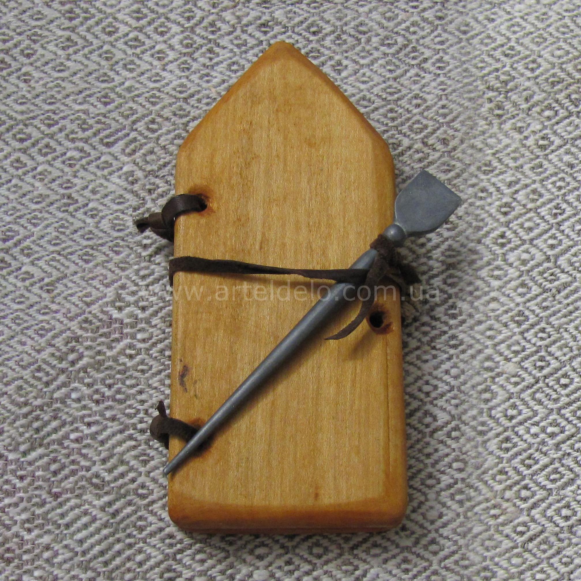 Two wooden planks connected by a leather cord, with a recess for pouring wax according to a medieval recipe. They were used for business records (medieval tablet) in Europe and Rus’ from ancient times until the 16th century. The form and ornament are respectively historical sources or stylized for the Middle Ages. Hardwood species. Writing pens are sold separately. Gift packaging with historical information in two languages: Ukrainian, English.