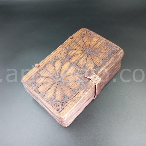 Five wooden boards connected by a leather cord and have a clasp, with a recess for pouring wax according to a medieval recipe. They were used for business records (medieval tablet) in Europe and Rus’ from ancient times until the 16th century. The form and ornament are respectively historical sources or stylized for the Middle Ages. Hardwood species. Writing pens are sold separately. Engraving. Ornaments in assortment. Gift packaging with historical information in two languages: Ukrainian, English.